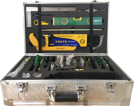 工具箱采用圆弧型材和铝板外壳,内部设置有专门的成型内衬,固定工具,每个工具零件都有对应的金属铭牌标注