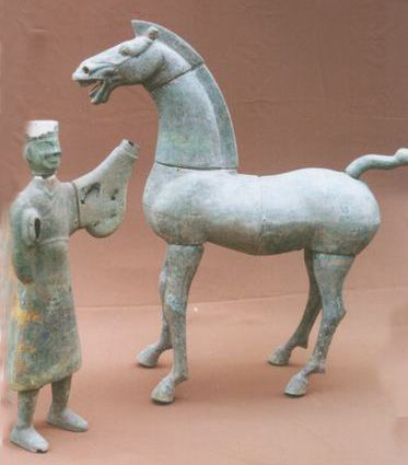 铜牵马俑马高51.1厘米、长45厘米、重12.15千克;俑高43厘米、重6千克