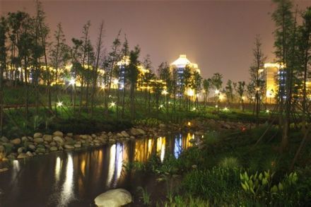 3、共享生态区:位于教学区与生活区之间,将基地内原有的水系和山林连为一体,形成活体水面和生态走廊,是校园景观主题和学生活动重要场所
