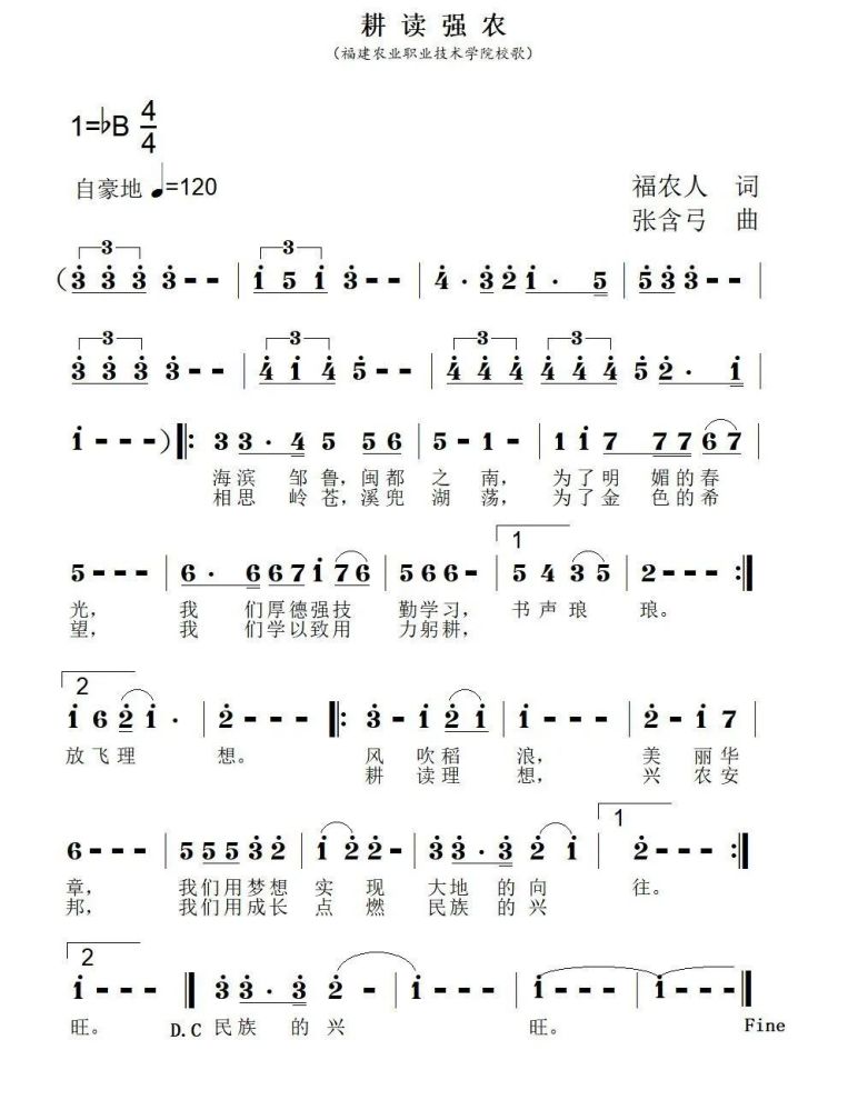 福建农业职业技术学院新校歌《耕读强农》于2022年3月4日发布,歌曲创作于百廿校庆到来之际,集中展现了一所学校的办学理念、办学特色